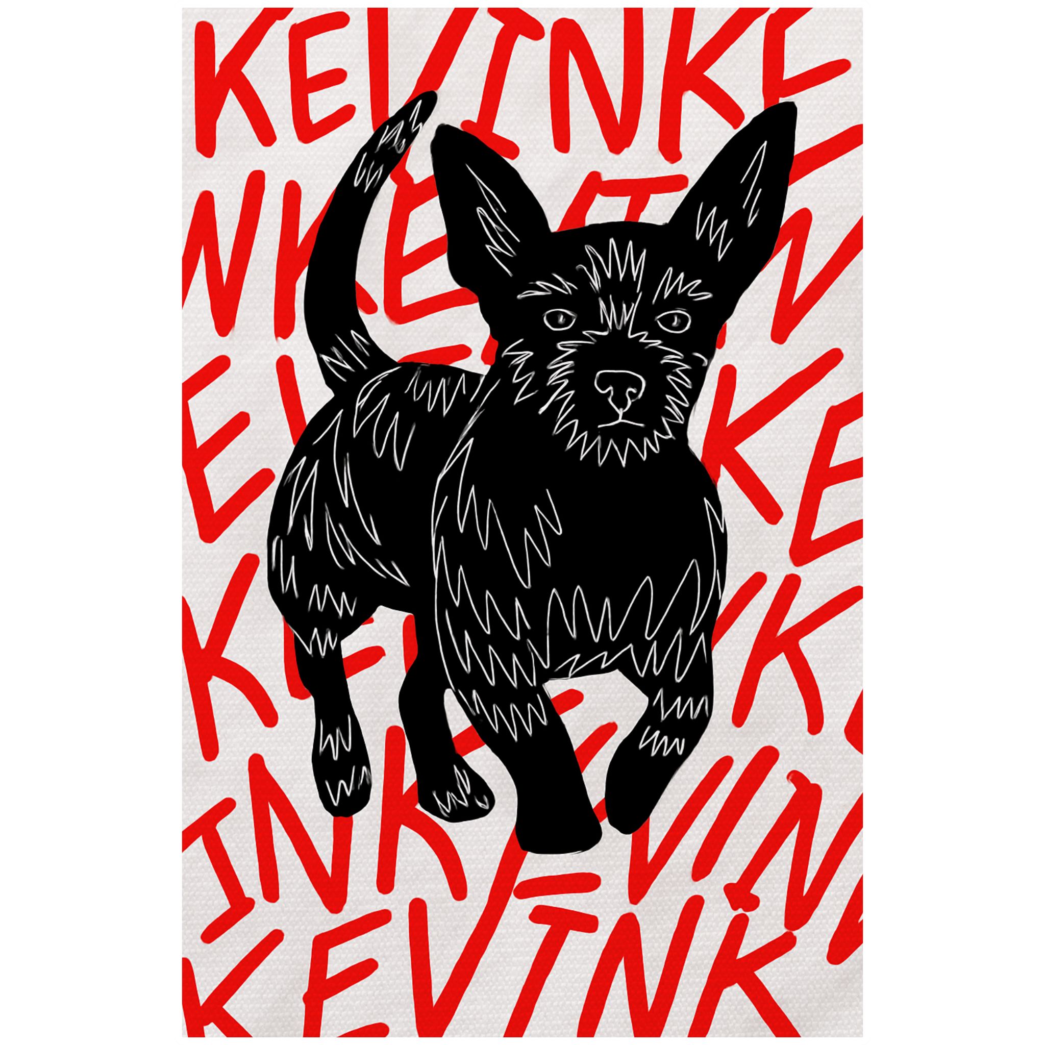 Graphic-style black dog artwork with vibrant red background text.